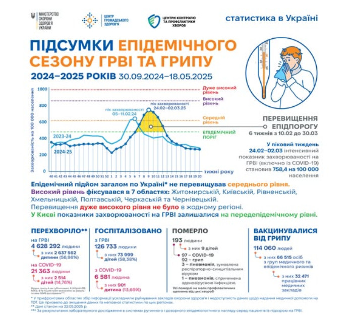 📉18 травня офіційно завершився епідсезон ГРВІ в Україні. Попри вищий пік захворюваності та довшу тривалість епідемічного підйому (на 2 тижні довше, ніж торік), загальна кількість хворих була меншою ніж минулого року, а рівень захворюваності на COVID-19 знизився у 7,4 раза.