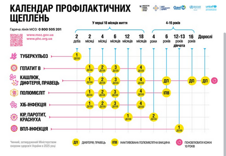 Оновлений Календар профілактичних щеплень з 1 січня 2026 року охоплюватиме обов’язкову вакцинацію проти 11 інфекційних захворювань: туберкульоз, гепатит В, кір, паротит, краснуха, поліомієліт, дифтерія, правець, кашлюк, ХІБ-інфекція та вірус папіломи людини (ВПЛ).