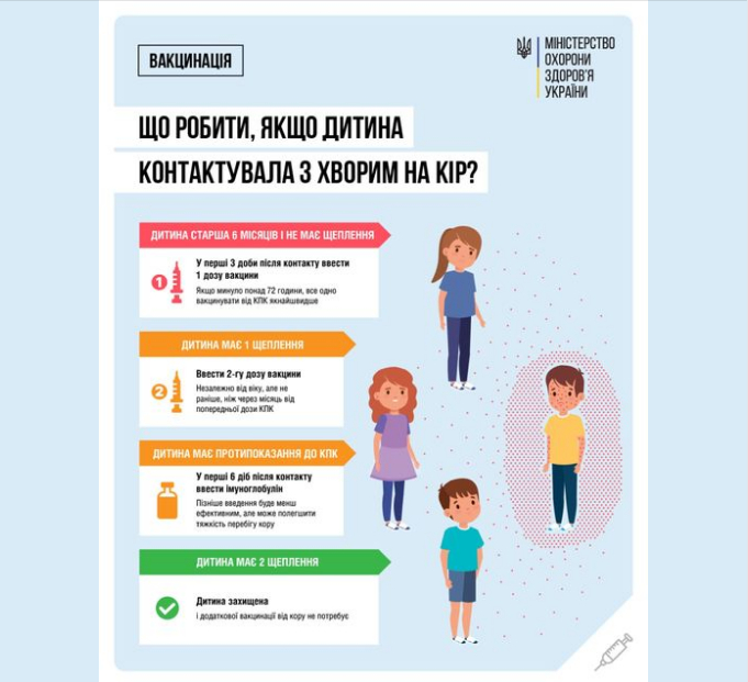 👉 Якщо дитина віком від 6 місяців до 12 місяців контактувала з хворим на кір, їй необхідно якнайшвидше – бажано протягом 72 годин – ввести одну дозу вакцини КПК.
